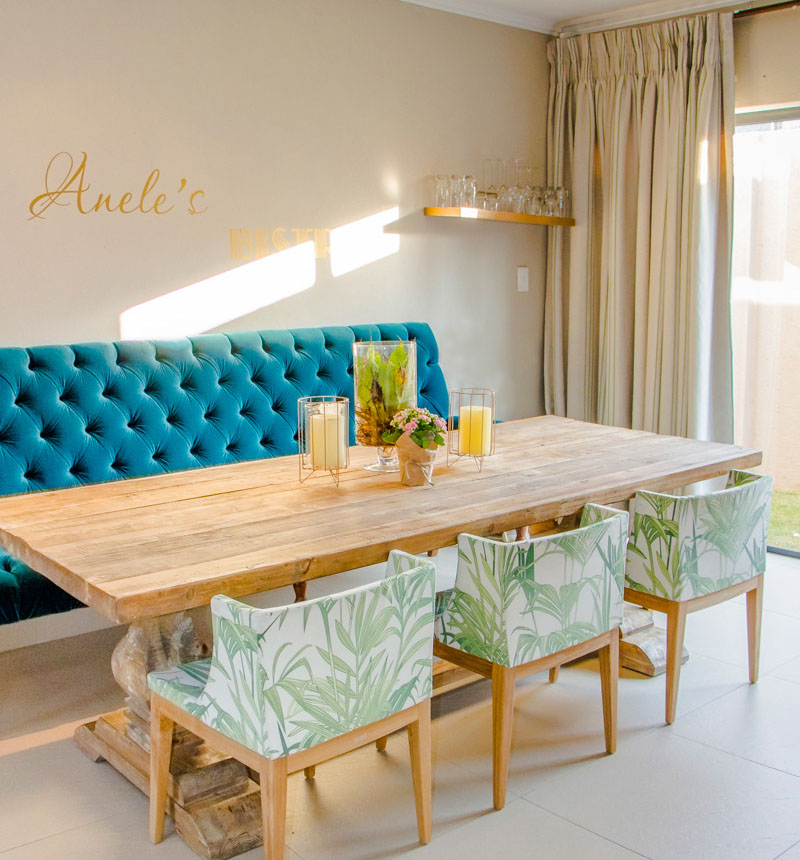 The client loves to entertain, so we custom designed a dining bench which would become the grand feature of the dining area. We balanced the formal dining bench with palm print chairs to bring back that comfortable casualness that our client sought.